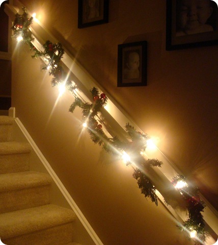 But, just because I don’t have them doesn’t mean I can’t make ours look beautiful too! In years past, I’ve wrapped garland with lights around the hand rail: