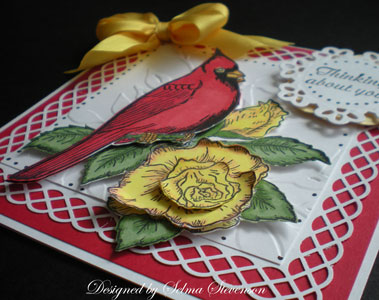 This is another one of the new Heartfelt Creations Spring Cardinal stamps called "HCPC 3382 Magnificent Cardinal Rose PreCut Set". A punched white backing was created with the Martha Stewart "String Lace" border punches. An additional white square was embossed with the Cuttlebug "Leafy Branch" embossing folder for the center. The cardinal was stamped with black Memento ink, colored with Copic markers and cut out. It was attached with dimensionals. An extra cardinal and rose were stamped so they would be dimensional. The sentiment is also from Heartfelt Creations and was cut out with one of the new Spellbinder dies. It was attached over a yellow "Big Scalloped Circle" Nestability. A yellow bow was added to complete the card.
